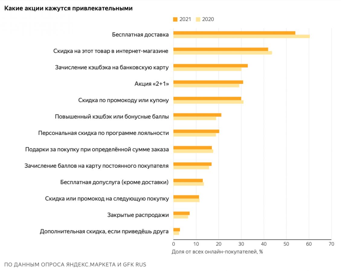 54 % россиян считают бесплатную доставку самой привлекательной акцией. На втором месте — скидки (42 %). На третьем — зачисление кэшбэка за покупки на банковскую карту (33 %).
