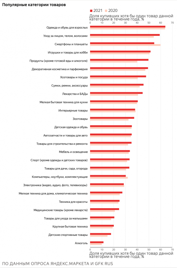 Результаты опроса показали, что наибольшим спросом пользуются одежда и обувь для взрослых. Хотя бы раз в течение года товары из данной категории покупали 64 % респондентов. На втором месте средства для ухода за лицом, телом и волосами, их приобретали 59 % опрошенных.