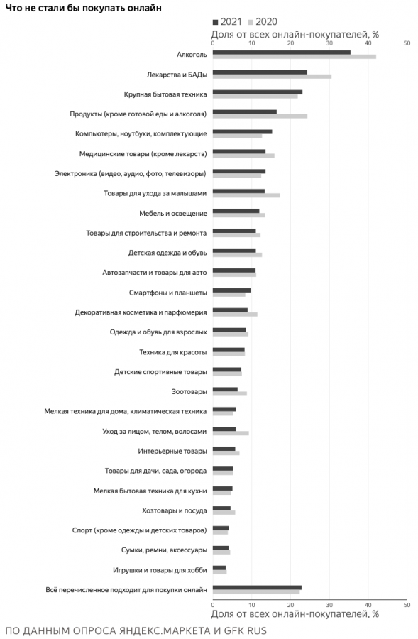Среди товаров, которые не стали бы покупать онлайн, россияне чаще всего называли алкоголь (36 %), лекарства и БАДы (24 %). По сравнению с прошлым годом доля респондентов, не готовых покупать эти товары в интернете, снизилась.