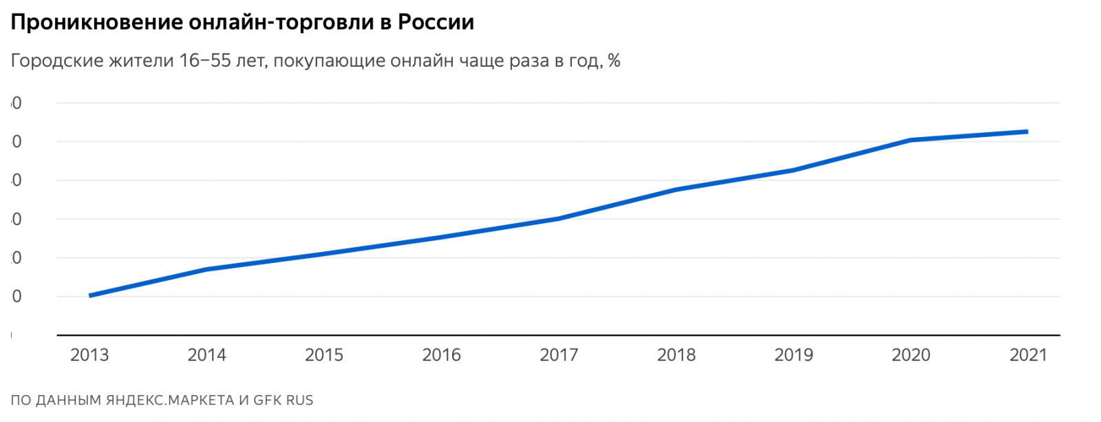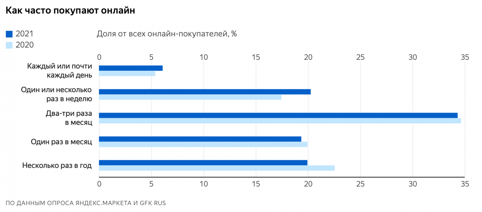 «Яндекс.Маркет» и компания GfK Rus провели ежегодный опрос российской аудитории интернет-магазинов, его результаты есть в распоряжении Sostav. Согласно отчёту по данным за 2021 год, половина городских жителей в возрасте от 16 до 55 лет совершают онлайн-покупки минимум два раза в год. 80 % из них оформляют заказ через интернет минимум раз в месяц, 26 % — минимум раз в неделю.