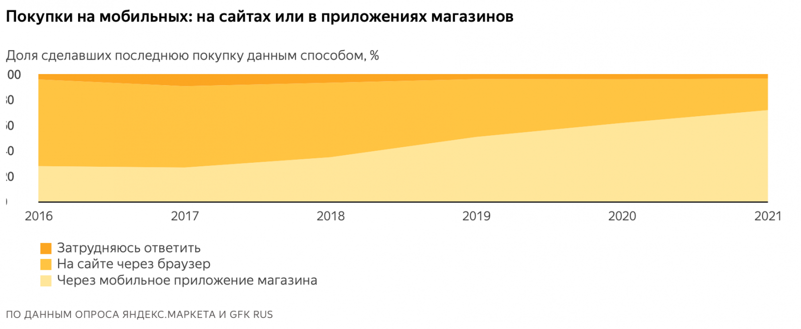 При этом аналитики отметили, что доля онлайн-покупок, сделанных с мобильных устройств, продолжает расти — в этом году она превысила 60 %. При оформлении заказа со смартфона покупатели чаще используют приложение магазина, а не сайт.