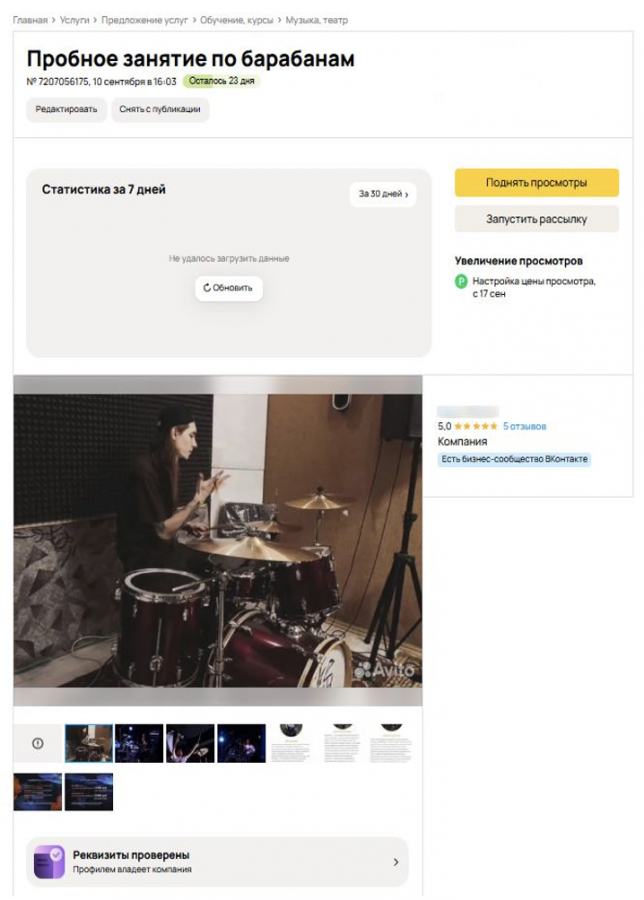 Мы искали новые способы привлечения заявок на наши уроки игры на барабанах. Уже по итогам первого месяца «Авито» показал себя как эффективный источник с высокой окупаемостью. Следующий шаг работы для нас — поиск инструментов масштабирования при ограниченном радиусе офлайн точки школы.