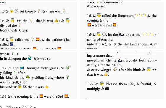 Перевод, получивший название "Писание для Миллениалов", занял около шести месяцев, в результате объем книги составил 3300 страниц. В общей сложности автор использовал 80 эмодзи, которыми заменил наиболее повторяющиеся слова. Текст священного писания специально сокращен таким образом, чтобы его было легче уместить в твиты. Необычную Библию можно приобрести в iTunes за 2,99 долларов.