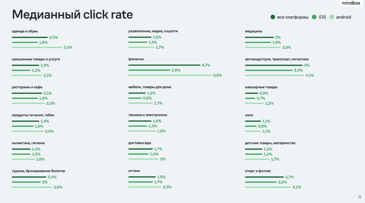 Пользователи iOS охотнее подписываются на пуши. В зависимости от индустрии доля подписок на iOS выше на 8−18 процентных пунктов. Возможно, это связано с техническими аспектами: на Android легче отписаться от пушей.