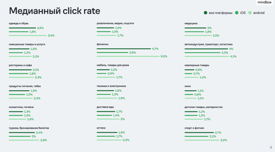 Владельцы мобильных устройств на базе операционной системы Android активнее кликают на пуши. Так, click rate пушей на Android в 1,5 раза выше, чем на iOS. Об этом говорится в исследовании платформы автоматизации маркетинга Mindbox. Отчет есть в распоряжении Sostav.