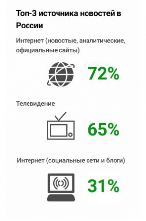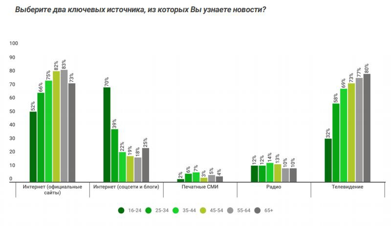 Для возрастной группы 16−24 основным источником информации является интернет: соцсети и блоги (70%), а также официальные сайты (52%). Для россиян старше 25 лет интернет также является основным источником новостей, но они отдают предпочтение официальным новостным и аналитическим сайтам (66−83%). По мере увеличения возраста наблюдается рост значимости телевидения в качестве источника получения новостей: от 32% для возрастной группы 16−24 до 80% — для россиян старше 65 лет.