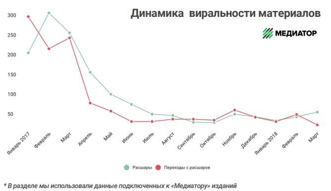 К аналогичному выводу пришел и проект «Медиатор», изучив среднемесячное количество расшаров и переходов по ним с января 2017 года по март 2018-го.