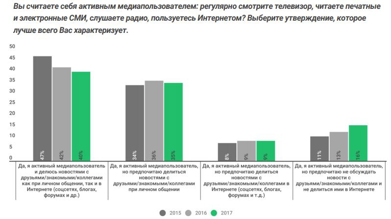Россияне старшего возраста предпочитают делиться новостями лично, особенно в возрастной группе от 60 до 64 лет. В 2017 году их доля составила 43%. Среди молодежи 16−19 лет несколько выше доля активных медиапользователей, которые предпочитают делиться новостями в интернете, но она составляет всего 13%. Меньше всего расположены делиться новостями (как в интернете, так и лично) россияне в возрасте от 55 до 59 лет, а также от 65 лет. Таких 26% и 29% соответственно.