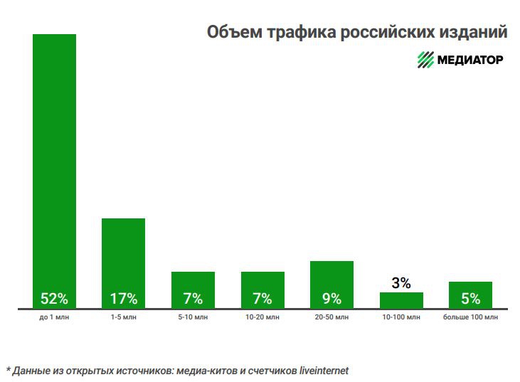 Типичное российское медиа — небольшое: у 52% изданий меньше миллиона просмотров в месяц. Больше 20 миллионов просмотров имеет 17% изданий, в основном это федеральные новостные и развлекательные медиа. У 31% трафик варьируется от 2 до 20 миллионов. 75% онлайн-изданий составляют региональные новостные и тематические медиа. Аудитория этих изданий ограничена населением региона или интересом к теме.