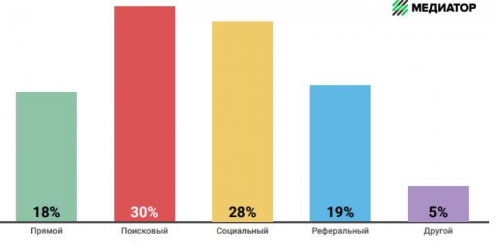Основным каналом трафика для российских изданий является поиск. Он составляет 30% от общего числа просмотров. Доля прямого трафика снижается из-за растущего количества переходов из соцсетей и мессенджеров. Это распределение условно, потому что один и тот же источник может оказаться в нескольких каналах одновременно. Например, трафик из VK обычно попадает сразу в три места: социальный, реферальный и канал other. То же происходит с трафиком из Facebook и Яндекс.Дзен. А в прямой трафик попадают переходы по ссылкам из Skype и мессенджеров. Utm-метки также влияют, в какой канал попадет источник.