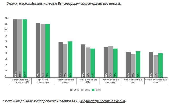 Средний уровень медиаохвата российской аудитории в 2017 году составил 63%, свидетельствуют данные Deloitte. Показатель практически не изменился с прошлого года. В прошлом году доля россиян, которые считают себя активными медиапользователями, снизилась на 3 п.п. и составила 84%. Большинство из них делится информацией и новостями как в интернете, так и при личном общении. Таких 40%. Доля тех, кто предпочитает общение в онлайне, всего 9%.