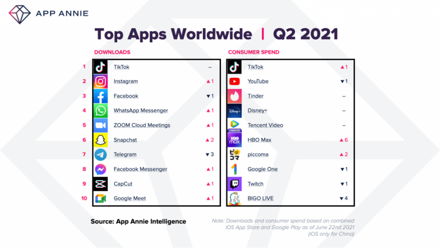 TikTok продолжает сохранять свое доминирующее положение — в среднем пользователи в США проводят в приложении 24,5 часа в месяц, а в Великобритании — почти 26 часов, обогнав YouTube по количеству привлеченных пользователей. Также TikTok находится на 2 месте среди прорывных приложений.