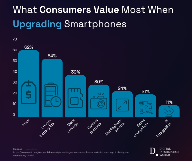 Только 11% владельцев смартфонов готовы обновить свое устройство из-за функций ИИ. Примерно трое из десяти опрошенных заявили, что ИИ в телефонах бесполезен. Такие данные содержатся в опросе Digital Information World.