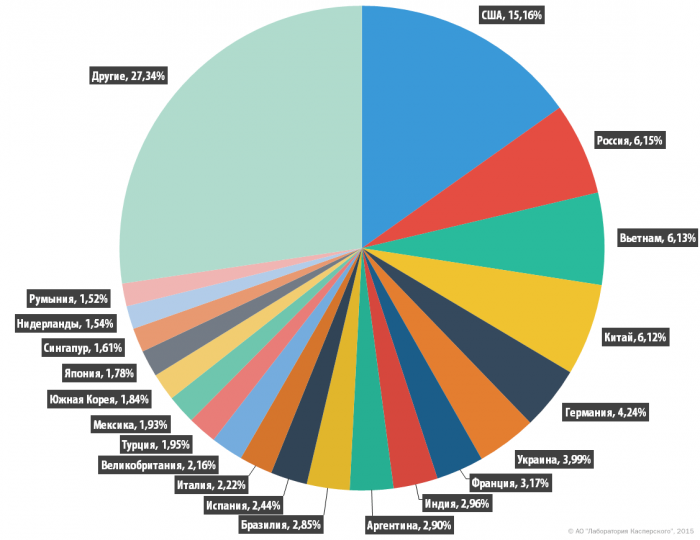 В 2015 году спам последовательно сдавал свои позиции. Наиболее значительный спад наблюдался в первом полугодии: если в январе на спам приходилось 62% почтового трафика, то в апреле его доля сократилась до 53,6%. Далее этот показатель изменялся незначительно и по итогам прошлого года составил 55%. Снижение связано с миграцией рекламы легальных товаров на более удобные платформы, например, в социальные сети и купонные сервисы. Большая часть почтового мусора рассылалась из США (15%), на втором месте — Россия с 6%, говорится в отчете «Лаборатории Касперского».