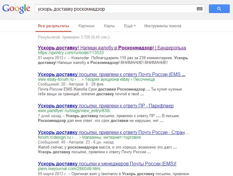 Действительно, поисковый запрос «ускорь доставку роскомнадзор» выдает множество ссылок на инструкции «Как привлечь к ответу Почту России». Так, на форуме eBay призывают писать жалобы и требовать от «Почты» ускоренной доставки. Для этого необходимо подставить собственные данные в готовый образец. Пользователям не советуют направлять жалобу в региональные подразделения Роскомнадзора.