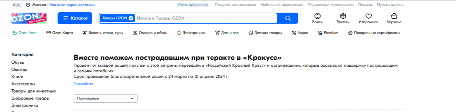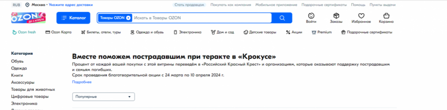 - Ozon создал специальную витрину с двумя сотнями тысяч товаров, и будет перечислять с 24 марта по 10 апреля процент с каждой покупки в Российский Красный крест и другие организации, которые помогают пострадавшим.