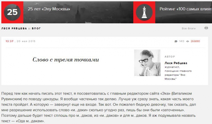В своем блоге на сайте «Эха» Рябцева назвала оппозицию «демокраклами», «безжалостными, одновременно бесхребетными и врущими самим себе жлобами». Через несколько дней она написала «оду м...дакам», после чего Корзун окончательное решил покинуть радиостанцию.