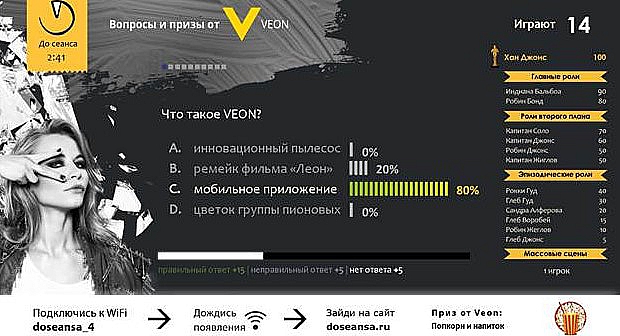 Новая рекламная платформа создана компанией «Синема 360» – федеральным оператором рекламы в кинотеатрах и одним из партнеров агентства Starcom. Для зрителей интерактивная викторина в начале киносеанса – новая и нескучная активность, отлично скрашивающая время в ожидании фильма. Благодаря технологии second screen посетители кинотеатра прямо со своего смартфона играют на большом экране и соревнуются с другими зрителями за приз от VEON – попкорн и напиток.