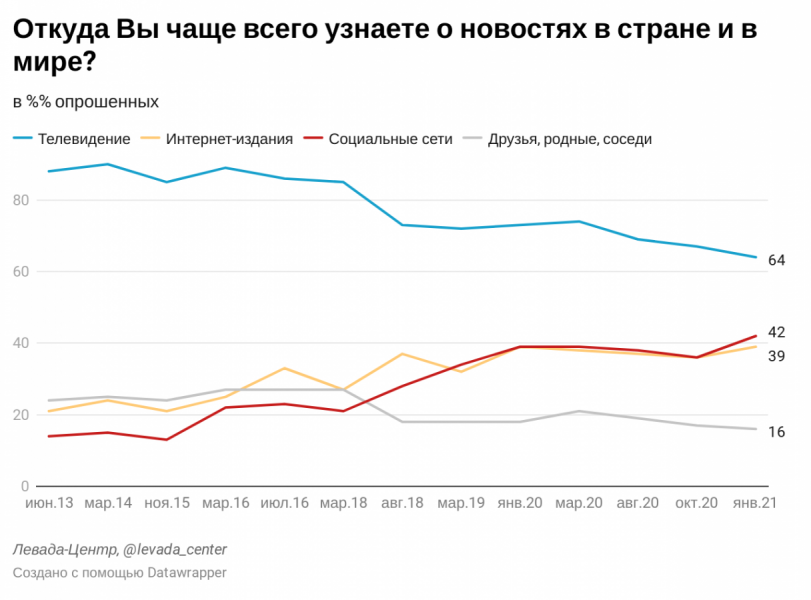 Самым популярным источником информации среди россиян остается телевидение — его смотрят 64% респондентов. Социальные сети вместе с интернет-изданиями стабильно удерживают второе место в качестве основного источника новостей — 42% и 39% соответственно, следует из данных опроса «Левада-центр».