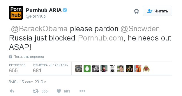 "Барак Обама, пожалуйста, помилуйте Эдварда Сноудена. Россия только что заблокировала PornHub, ему нужно срочно выбираться оттуда", - говорится в сообщении.