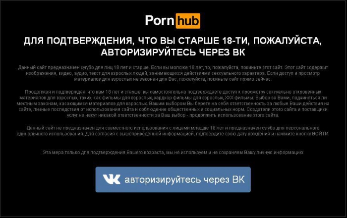 Pornhub обязал пользователей из России авторизироваться через соцсеть «ВКонтакте» перед посещением сайта.