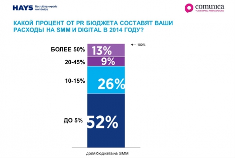 Digital сегодня занимает отдельную часть в PR-бюджетах компаний. Свыше 13% респондентов сообщили, что расходы на digital составят в 2014 году больше половины PR-бюджета их компании. 9% процентов компаний потратят на digital от 20% до 45% своего PR-бюджета, 26% компаний — от 10% до 15%. Увеличение расходов на digital планируют те компании (их 44%), которые уже сейчас выделяют на digital значимую часть своего PR-бюджета.