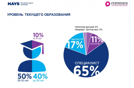 Подавляющие большинство опрошенных профессионалов имеют высшее образование в области смежных профессий: маркетинга, коммуникаций, PR и журналистики; 15% имеют дополнительное образование на базе школы ИКРа, центра «Нетология», академии BBDO и Британской школы дизайна; 20% отметили наличие иного профильного дополнительного образования; 12% окончили международные курсы и 13% прошли тренинги, организованные работодателями.