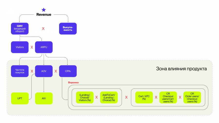 Метрики всегда зависят друг от друга: например, прибыль рассчитывается как разница между доходами и расходами. В больших компаниях, где их количество исчисляется сотнями, таких взаимосвязей много и они находятся на разных уровнях. Допустим, выручка интернет-магазина зависит от емкости выкупа и входящего оборота, который, в свою очередь, формируется от количества покупателей и средней выручки на клиента. Последняя складывается из частоты покупок, среднего чека и конверсии. И так далее.
