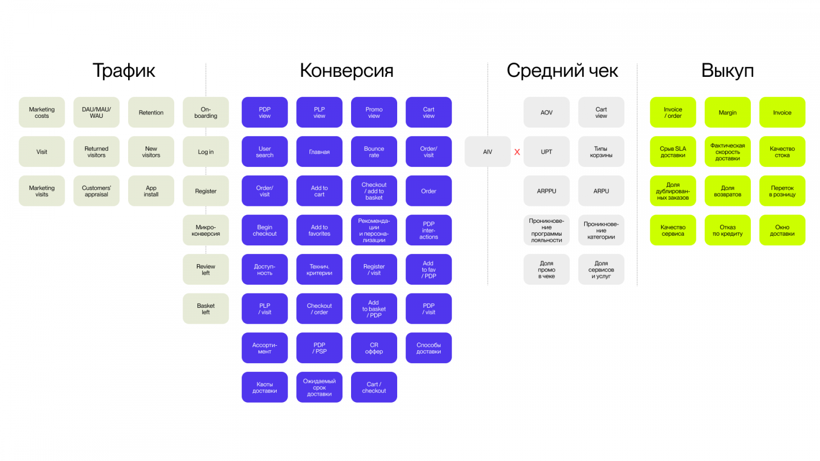 Выглядит довольно внушительно, хотя это далеко не все метрики бизнеса, а только зона конверсионной воронки внутри продукта.