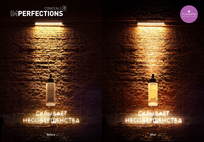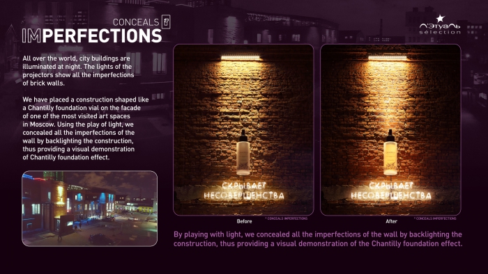 «Скрывает несовершенства», - светится под тональным кремом Chantilly лаконичная надпись. Из тюбика, установленного на кирпичном фасаде московского арт-центра, исходит контрастный свет и стена кажется ровнее. Так креативщики агентства Possible Group решили продемонстрировать прохожим, как тональный крем скрывает несовершенства. Руководство дизайн-завода «Флакон» согласилось предоставить свой фасад для размещения рекламной конструкции. Флакончик тонального крема провисел над входом в арт-центр 10 дней.