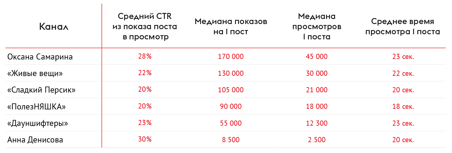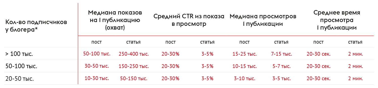 Чтобы прогнозировать KPI, при подборе блогеров стоит смотреть на медиану показов и просмотров, высчитывать средний CTR из показа в просмотр. Для примера собрали данные по некоторым каналам блогеров: