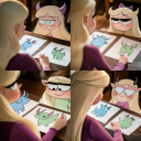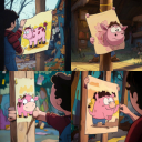 hand tapes a paper sheet with a drawing of a pink cow to a wooden pole, in the style of Cartoon Network studio, Gravity falls, Stiven Universe cartoon