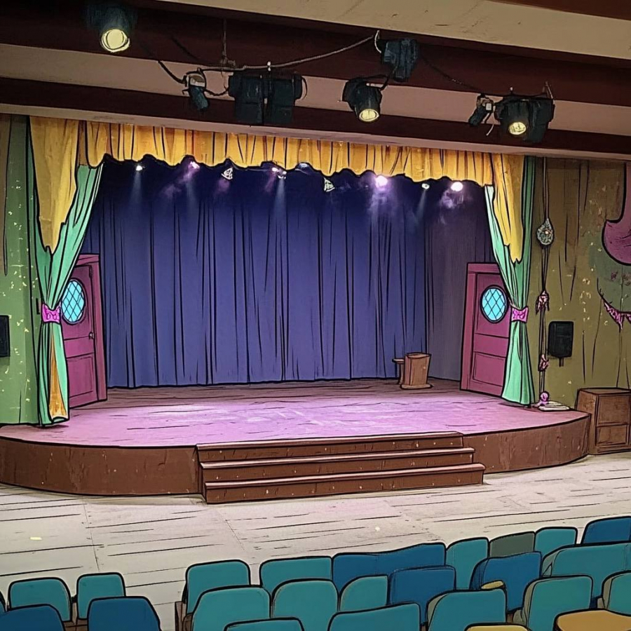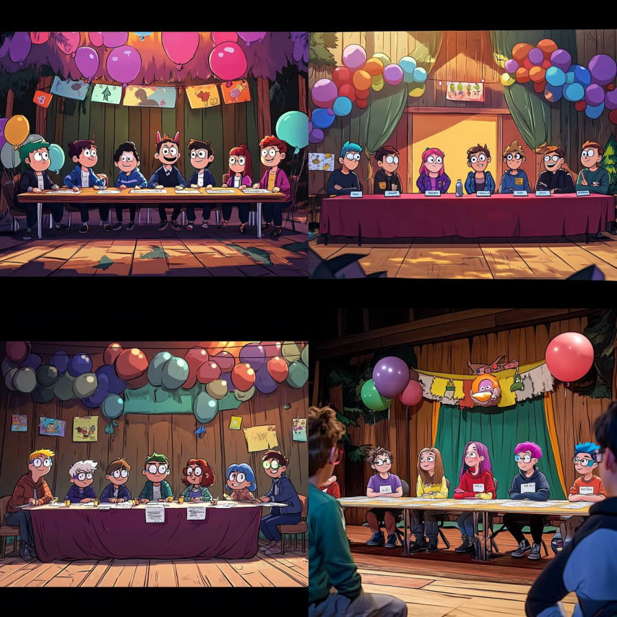 five people sitting at a long table on the stage of a village club there's balloons on the walls, children's artwork on the walls, there are name tags on the table near five people, some people have colored hair, some people have cool glasses, modern clothes, in the style of Cartoon Network studio, Gravity falls, Stiven Universe cartoon