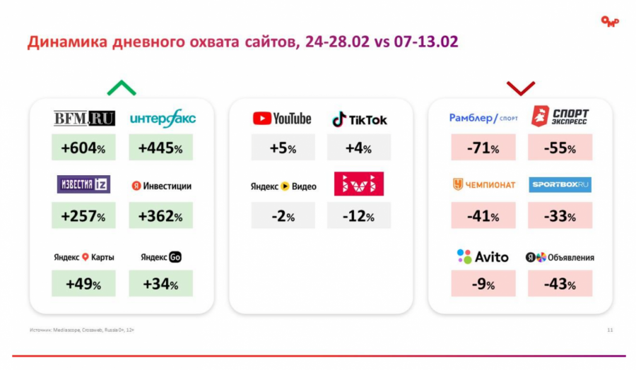 В интернете за прошедшую неделю был зафиксирован рекордный рост интереса к новостям и финансам, картам для поиска банкоматов и новых территориальных единиц, а также к сервисам «Яндекс.Go» для перемещения по городу за покупками и снятию наличных средств. Крупные видеосервисы и соцсеть коротких видео TikTok показали небольшой прирост на фоне замедления работы соцсетей Facebook и Instagram (принадлежат Meta).