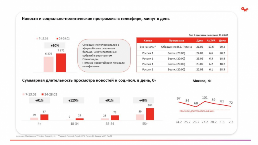 Со стороны медиапотребления не наблюдается общего роста телесмотрения, подчёркивают в OMD OM Group. Однако на 20% увеличился новостной контент в эфирной сетке, а интерес к нему возрос на 50−120%, в зависимости от целевой аудитории (ЦА).