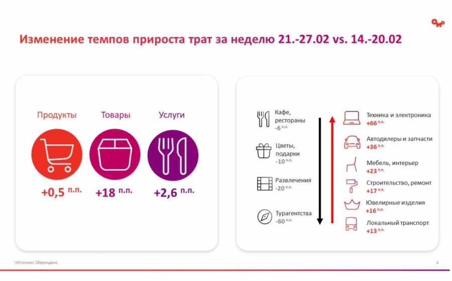 А вот «ожидаемого» роста трат на продукты питания не случилось, и спрос поднялся всего на 0,5 процентных пункта, отмечается в отчёте со ссылкой на данные «Сбериндекса». При этом радикальное изменение потребительских расходов и динамика направлений трат схожа с ситуацией в период начала пандемии (конец марта 2020 года) и последующим локдауном.