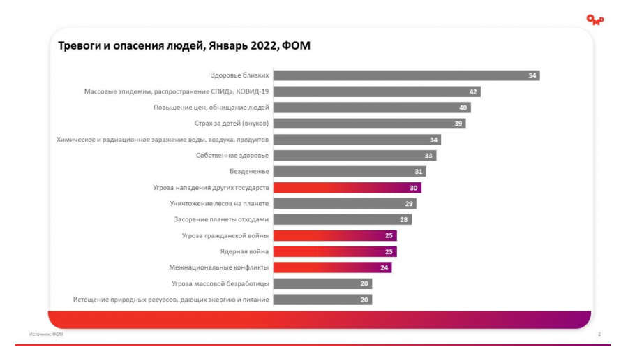 По данным фонда «Общественное мнение» (ФОМ), в январе помимо переживаний за здоровье, родных и близких россиян беспокоили «угроза нападения другого государства», «угроза гражданской войны», «ядерная война» и «межнациональные конфликты».