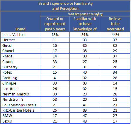 Американская компания American Affluence Research Centre представила результаты очередного исследования рынка роскоши. Эксперты опросили 327 состоятельных жителей США, большая часть которых (93%) имеет личный капитал свыше 1 млн долларов. Им предложили оценить 17 торговых марок: респонденты отвечали, пользовались ли они продукцией под этим брендом, знакомы ли с ним, насколько он переоценен и к чему апеллирует (статусу потребителя, качеству товара, богатству и так далее).