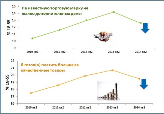 Кроме этого, российские потребители в меньшей мере стремятся переплачивать за бренд и более качественные товары. По сравнению с прошлым периодом, на 11% снизилось число россиян, готовых тратить дополнительные средства на известную торговую марку.