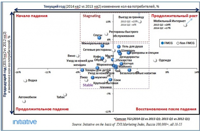 Что касается товарных категорий, то большинство товаров массового спроса в 2014 году остаются стабильными, однако категория алкогольных и табачных товаров падает. На 15% процентов снизилось количество покупателей алкогольной продукции, на 8% процентов – табачной. Самое большое падение спроса наблюдается в автомобильной категории - количество покупателей автомобилей в этом году уменьшилось на 15% процентов. На отдыхе, по-прежнему, россияне экономить не хотят. Однако стремительного роста данной категории, который наблюдался последние два года, уже нет. Если в прошлом году количество отдыхающих за границей выросло на 23%, то в текущем году – на 4%.