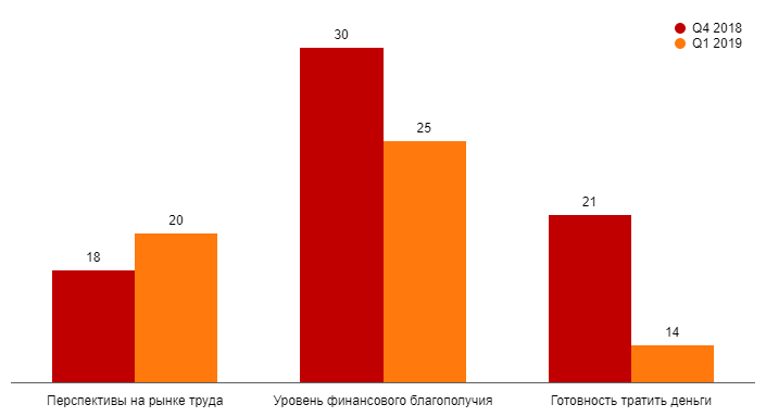 Индекс потребительского доверия (Consumer Confidence Index, CCI) складывается из оценки респондентами трех показателей: уровня финансового благополучия, готовности тратить деньги и перспектив на рынке труда. Между ними нет жесткой функциональной связи. Так, если по данным волны I квартала 2019 года первые два показателя показали ухудшение общей ситуации, то третий, отражающий отношение респондентов к возможности сменить работу, наоборот. Число опрошенных, которые с оптимизмом оценивают свою ситуацию в ближайшие 6 месяцев, увеличилось на 2 п.п. до 20%.