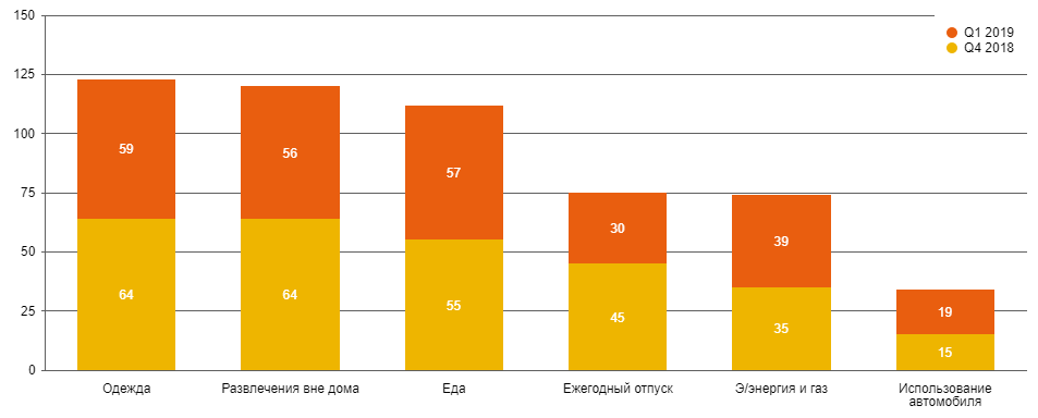 Как показывает исследование, люди будут переходить на более дешевую одежду и еду и сокращать затраты на развлечения вне дома. Отпуск тоже станет короче, но в меньшей степени, чем в конце прошлого года: за счет этой статьи расходов планируют экономить 30% и 45% респондентов, соответственно. А лидером по росту озабоченности людей в I квартале 2019 года стали слишком высокие расходы затраты на оплату ЖКХ, в частности, электроэнергию и газ. Похоже на то, что наши сограждане берут курс на энергосберегающие технологии.