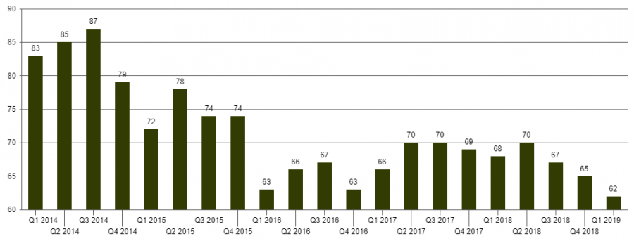 Индекс потребительского доверия россиян драматически упал в I квартале 2019 года до самого низкого значения с начала 2014 года — 62 пунктов, как это следует из данных глобального исследования CCI The Conference Board и Nielsen. По отношению к предыдущему, IV кварталу 2018 года, Индекс упал на три пункта, а к аналогичному периоду прошлого года — на шесть. Однако светлые пятна в этой довольно мрачной картине все же есть.