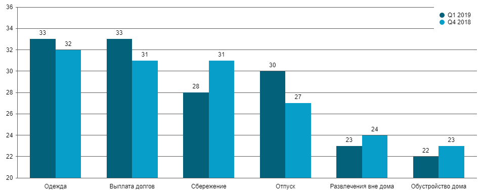 Чем ближе лето, т.е. традиционный период отпусков, тем больше люди готовы увеличивать свои расходы на эту статью (+ 3 пп в I квартале 2019 г. в сравнении с предыдущим кварталом). И это, кстати, согласуется зафиксированным исследователями уменьшением доли желающих сэкономить на отдыхе. А вот число планирующих отложить часть свободных денег «на черный день» уменьшилось на те же 3 пп. Вряд ли между этими показателями есть прямая связь — «не стали откладывать, а решили потратить на отпуск», но косвенная — безусловно. Впрочем, вполне возможно, что часть людей вместо того, чтобы откладывать деньги, решила погасить долги, этот показатель вырос на 2 пп.