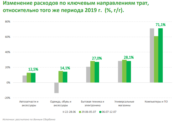 Лидерами трат россиян на прошлой неделе стали компьютеры и программное обеспечение. На них израсходовано на 71,1% больше, по сравнению с прошлым годом. В целом потребительское настроение россиян в июле осталось на уровне прошлого года, сообщается в исследовании SberIndex.