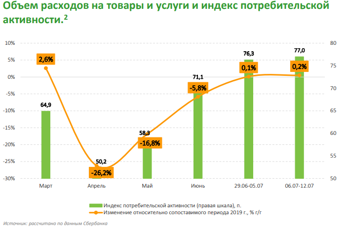 Индекс потребительской активности даже немного подрос — с 76,3 пункта до 77%. Восстанавливаются траты соотечественников на турпутевки, отели и авиабилеты. Так, отелям осталось наверстать только 39,5% до уровня 2019 г., при том, что границы еще официально закрыты. А еще в апреле эта категория рухнула до -96,3% относительно прошлого года.