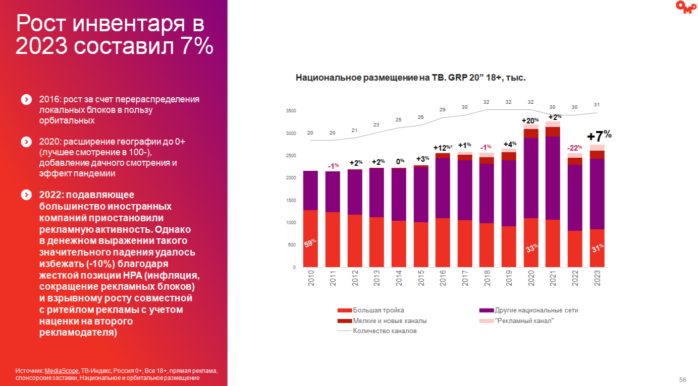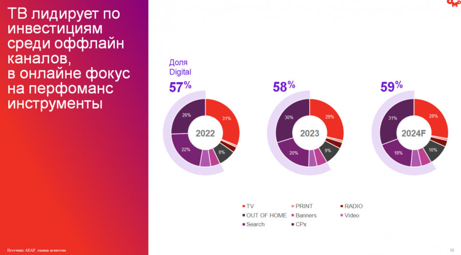 По количеству вложений в офлайн-каналы лидирует ТВ. Доля диджитал составила в 2023 году 59%. Резкое восстановление обеспечила высокая инфляция и выросший спрос рекламодателей.