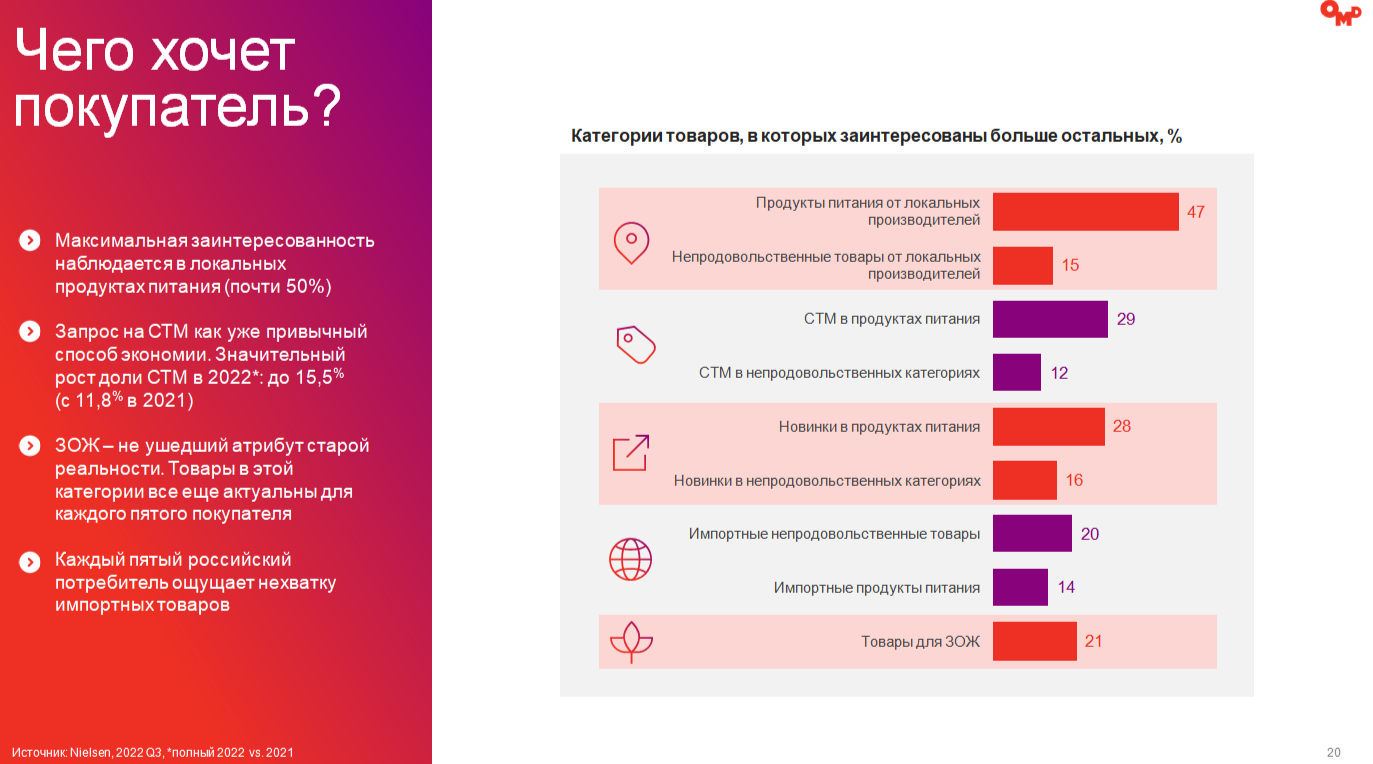 По данным Data Insight, динамика e-com рынка замедлилась и составила 31% (7,4 трлн руб.) в 2023 году. Потребители заинтересованы в локальных продуктах питания (50%). Зафиксирован значительный рост доли СТМ в 2022 году: до 15,5%, (с 11,8% в 2021 году). 28% потребителей заявляют об интересе к новым маркам продуктов питания, 20% хотят приобретать импортные непродовольственные товары.