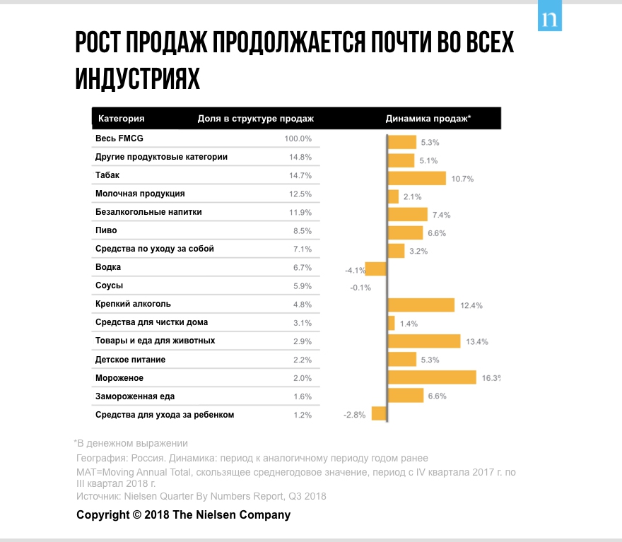 Сильнее других категорий FMCG в третьем квартале 2018 года в денежном выражении росли продажи мороженого — на 16,3%, что можно связать с жарким летом 2018 года, проведением ЧМ-2018 и низкой базой 2017 года. Эти же факторы повлияли на рост продаж пива (6,6%) и безалкогольных напитков (7,4%) в этом периоде. Среди других наиболее динамичных драйверов роста рынка табак (10,7%), крепкий алкоголь (12,4%) и еда для домашних животных (13,4%).
