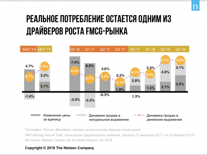 Для российского FMCG-рынка третий квартал 2018 года оказался достаточно позитивным: он вырос на 6,6% в денежном выражении, а реальное потребление по-прежнему продолжает оставаться заметным драйвером его роста. С января по сентябрь 2018 года FMCG-рынок показал наибольший рост в натуральном выражении с 2013 года. Это произошло несмотря на ускорение инфляции до 2,9% и снижение индекса потребительского доверия на 3 пункта до 67 — одного из наиболее низких значений за историю наблюдений.